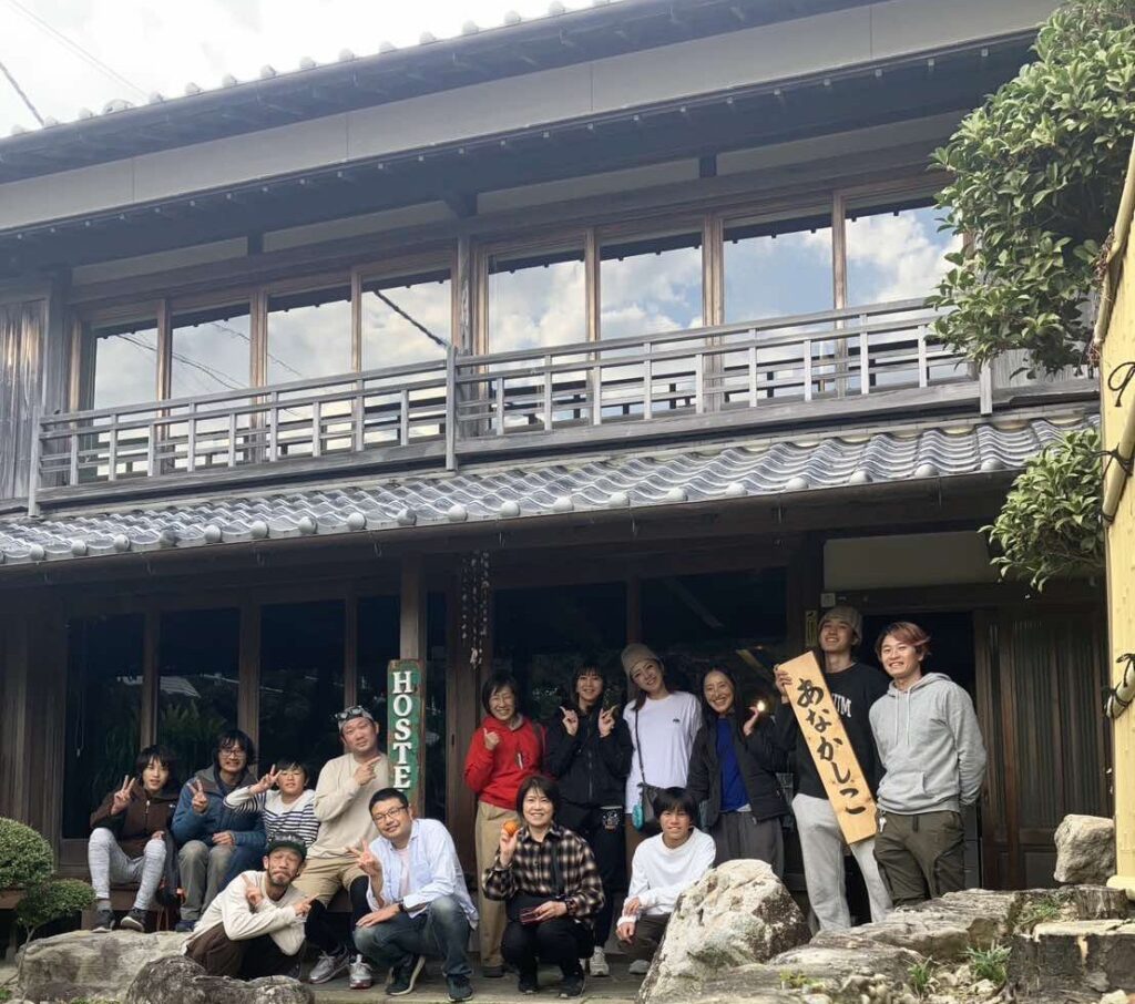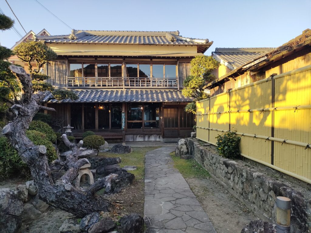 宿は、古民家を改装したドミトリータイプのゲストハウス「あなかしこ」。駅から徒歩5分以内、海からほど近く、庭や空間も丁寧に整えられた居心地のよい場所です。オーナーさんからは、ゲストハウス経営や、自身が経験したスペインの巡礼路「サンティアゴ・デ・コンポステーラ」の旅と日本の古道「熊野古道」とのこと、地域と旅、暮らしについて多くの話を聞かせていただきました。そら君とは、彼が高校生のころに改修途中のこの宿に泊まった縁があり、原さんもここに泊まったことがあり今回の宿泊先となりました。