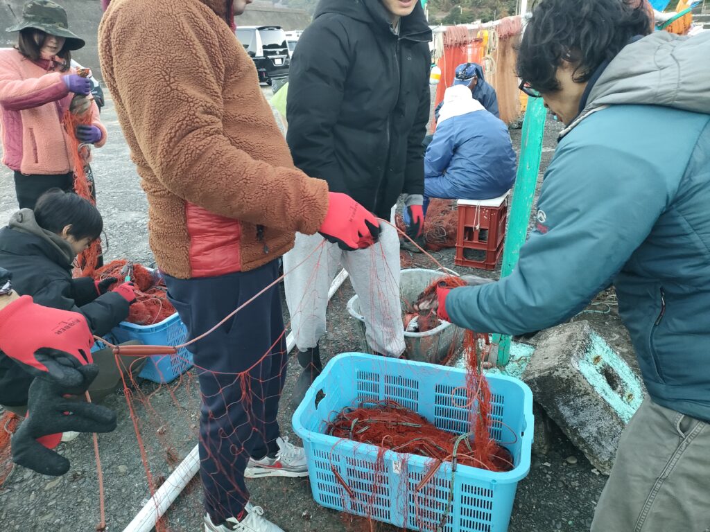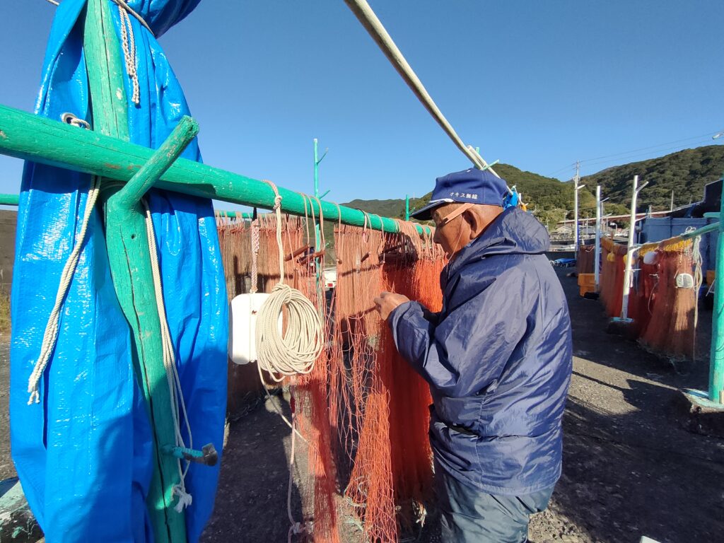 魚や海老を外したあとは、網の手入れと補修の時間。91 歳のベテラン漁師さんが、切れ目を丁寧につなぎ、網目をきれいなひし形に戻す様子には、長年の経験と技術、海との信頼がありました。刺し網漁は「漁をするだけ」で終わらず、「道具を育て、守る」営みでもあるのだと実感しました。