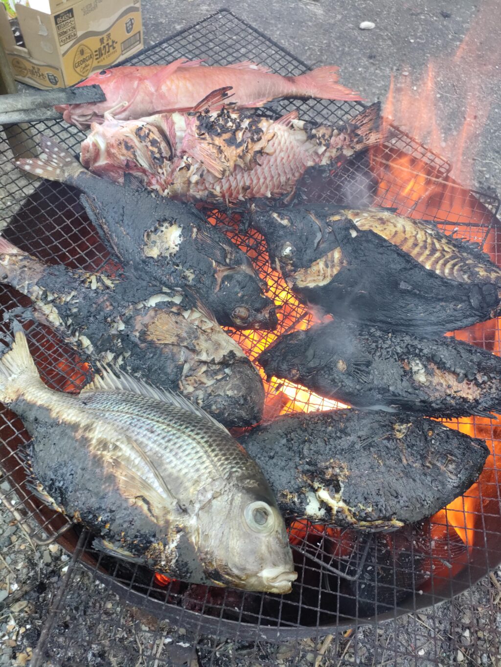 網にかかった魚たちの中には、流通に乗りにくく“未利用魚”とされるものが多く含まれています。普段なら捨てられてしまう魚たちを、一人一匹選んで丸焼きしました。捨ててしまうお魚たちも、焼きたての魚の美味しさは私たちにとっては贅沢な食事です。